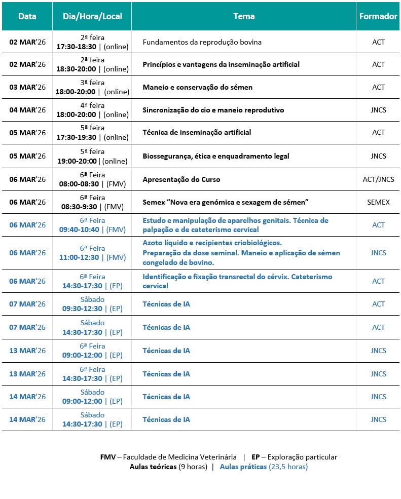 O curso de Inseminação Artificial em Bovinos, organizado pela secção de Reprodução da FMV em conjunto com o Núcleo Buiátrico, tem como público alvo estudantes finalistas de Medicina Veterinária ou Médicos Veterinários. O objetivo deste curso é proporcionar aos participantes os conhecimentos teóricos e práticos necessários à realização da inseminação artificial na fêmea bovina, complementando a formação adquirida no decorrer da sua formação em Medicina Veterinária.